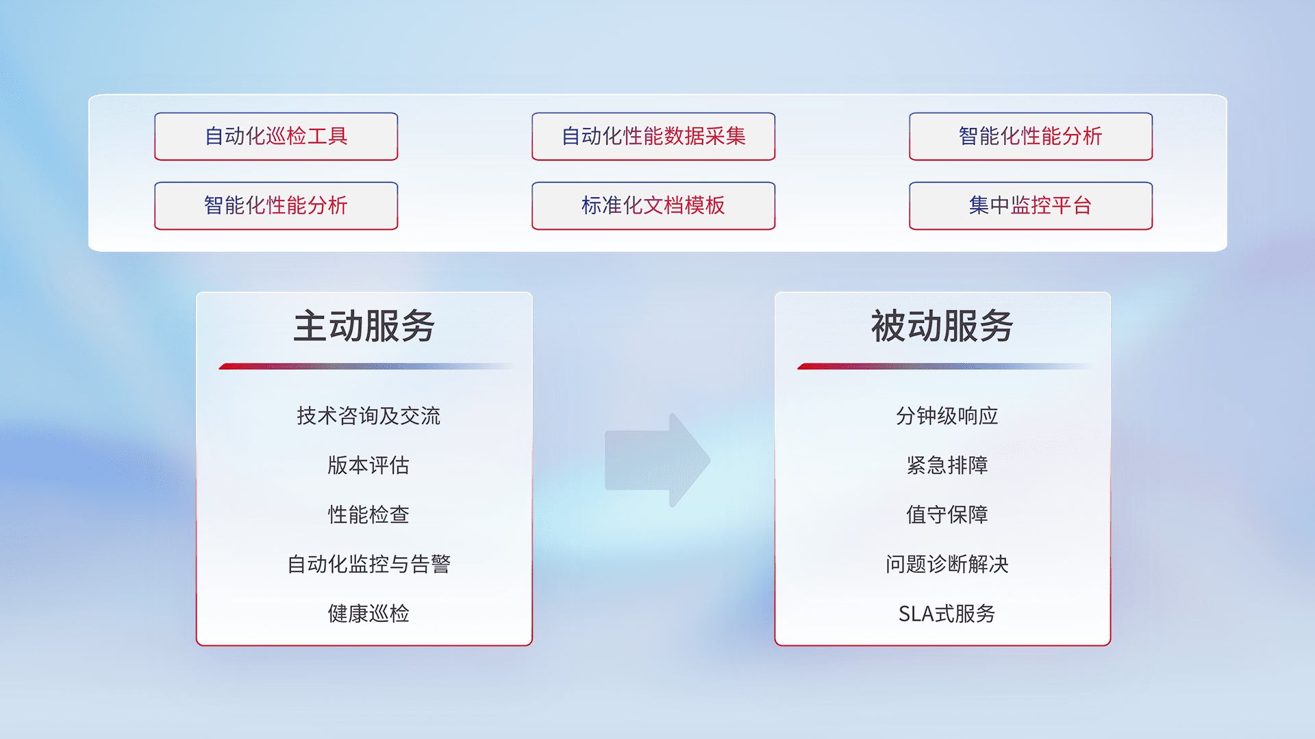 智能化工具和标准化文档,,,保障服务质量,,,,提供主动服务(包含技术咨询、、、、版本评估、、、、性能检查、、、自动化监控与告警、、、、健康巡检)和被动服务包含(分钟级响应、、、、紧急排障、、、、值守保障、、、、问题诊断解决、、、SLA服务)。。。。
